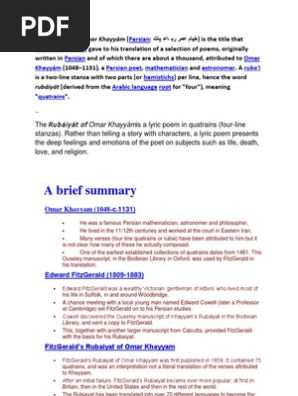 PDF Download - Edward FitzGeralds The Rubaiyat of Omar Khayyam is an English translation in verse of Omar Khayyams rubais. Rubaiyat is the plural of rubai in Persian Language. Philosopher mathematician astronomer and poet.